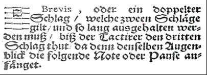 If we shall turn to the works of the prominent German theorist and composer W.C. Printz we will find detail information about the functions of ‘a director’ or ‘a shlagist’ (a ‘measurist’ in France). According to his explanations ‘brevis or a double strike [doppelter Schläge – i.e. two movements of the hand measuring meter on Semibrevis’es], lasting for two strikes should be held as long as the Tactirer [der Tactirer, i.e. a person measuring/beating meter] makes the third strike, when, in the wink of an eye17, the next note or pause should be started/taken’ [46, without pagination, Chapter IV; compared to the first edition (1689) in Latin the text of the title is a changed in some details].